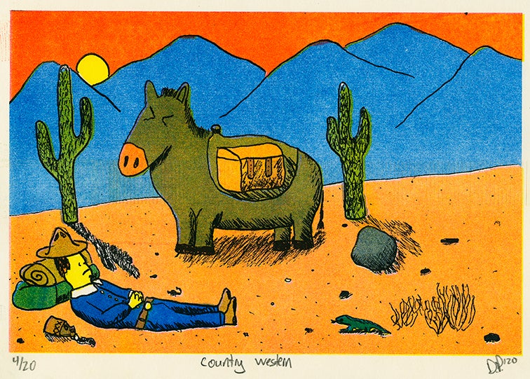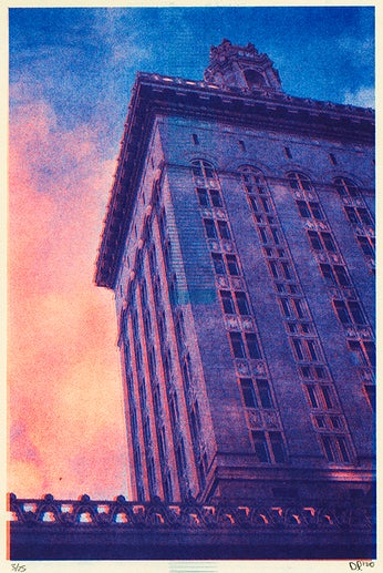 Risograph is based on a Japanese copy machine that has been appropriated by artists for high volume reporductions of prints, zines, posters, and more. The images are created by burning a stencil in rice paper within the machine. By loading different ink drums into the machine, you can build up a print color by color, similar to screenprinting.