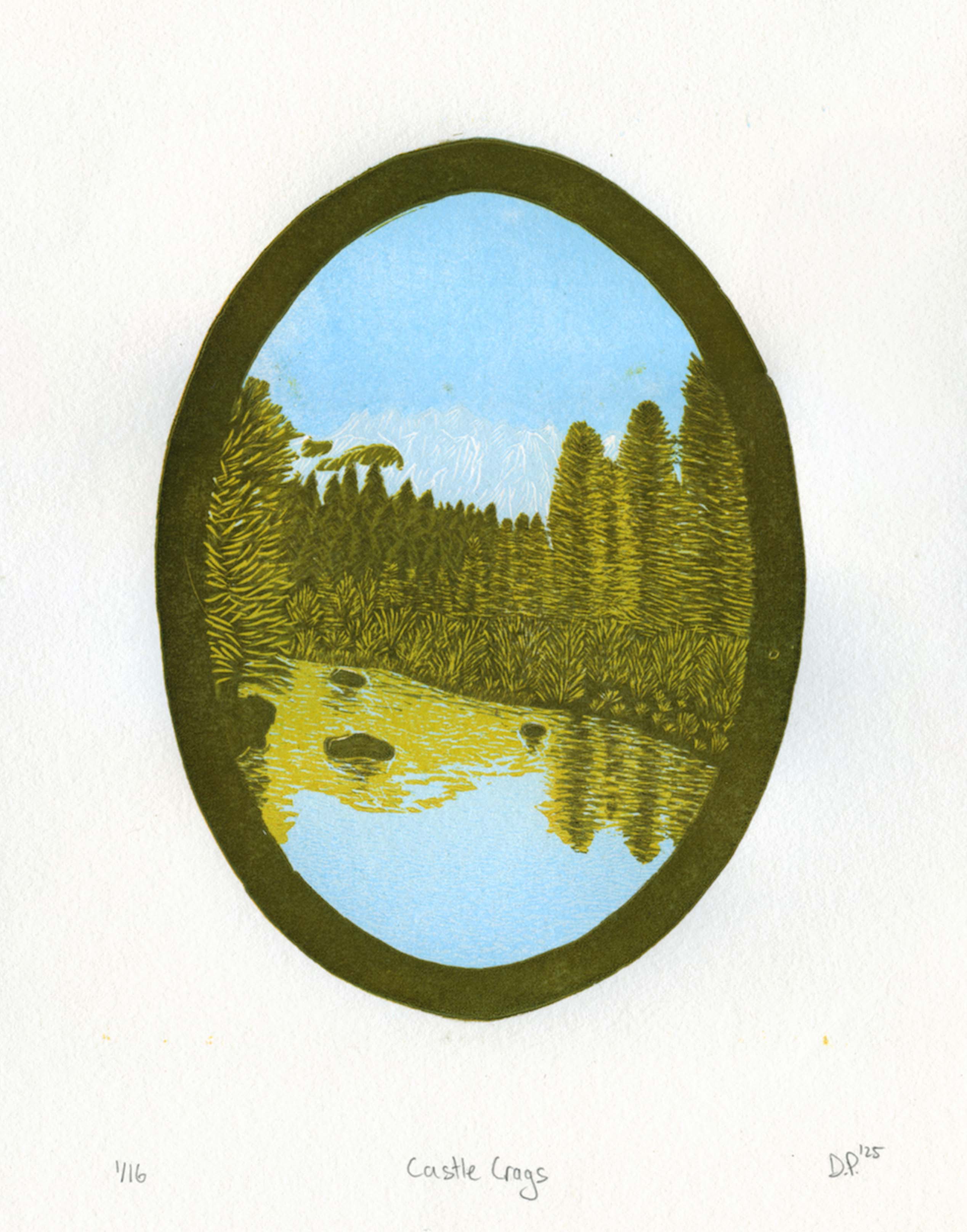Relief printing is a traditional technique in which material is carved away from a block of linoleum or wood to create a stamp, which can then be rolled up with ink and printed on paper. By making multiple stamps, or printing one layer and further carving the same block (reduction) you can make the multicolored prints shown above.